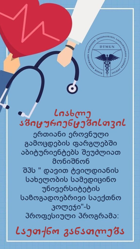 ერთიანი ეროვნული გამოცდების ფარგლებში აბიტურიენტებს შეუძლიათ მონიშნონ შპს ” დავით ტვილდიანის სახელობის სამედიცინო უნივერსიტეტის საზოგადოებრივი საექთნო კოლეჯი”-ს პროფესიული პროგრამა